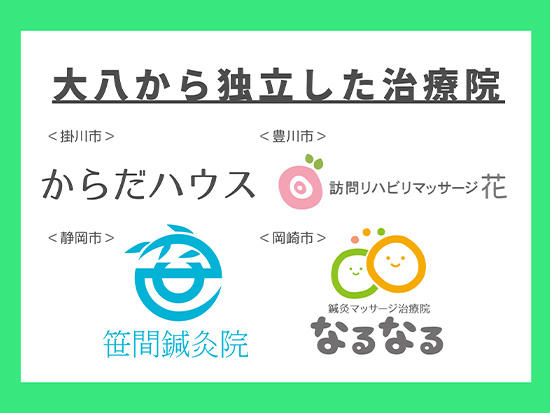 事業内容鍼灸マッサージ治療院、訪問リハビリマッサージ、アロマオイルトリートメント