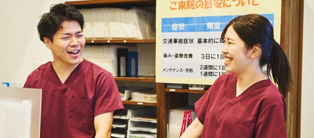 学校帰りや仕事終わりの患者様が増える時間帯。活気ある雰囲気の中で施術します。