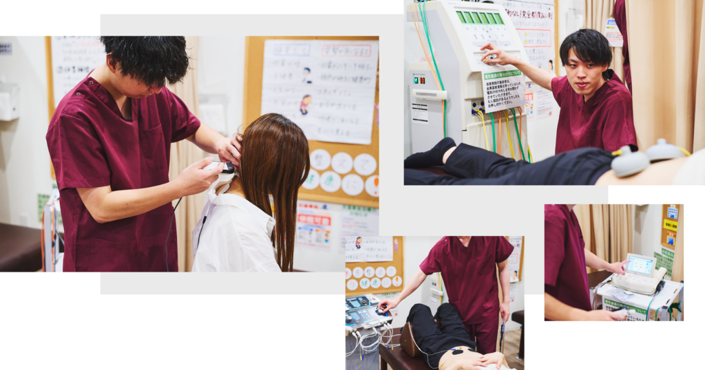めいほく独自の「SPT骨格バランス調整法」(深層筋×骨格調整)を習得可能。さらに、ソーマダイン、プロテクノエグゼ、ハイボルテージ、楽トレなど、プロアスリートも使用する最新機器を完備。手技の感覚だけでなく、機械による物理療法とデータを組み合わせた「治せる技術」が身につきます。